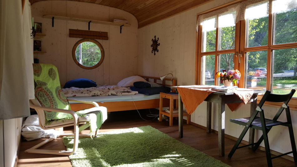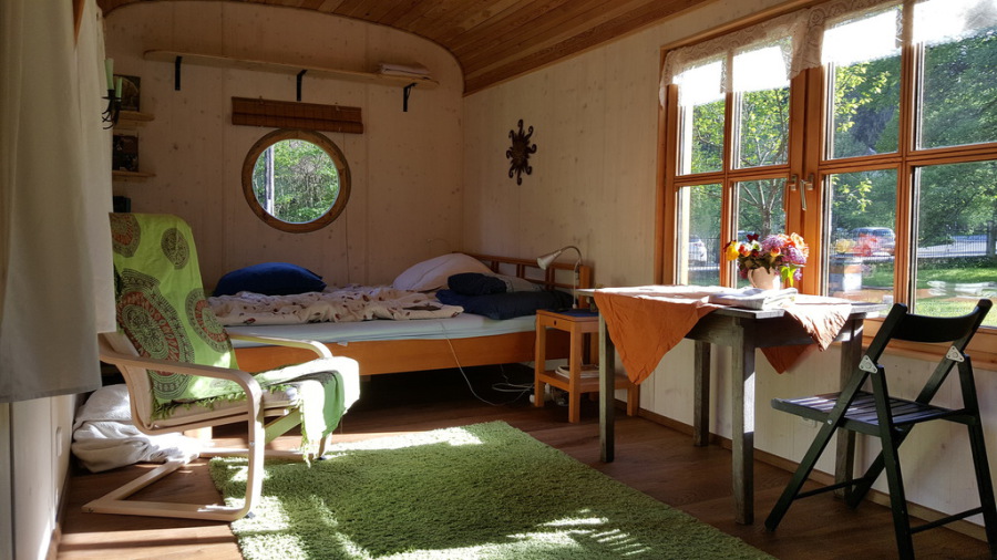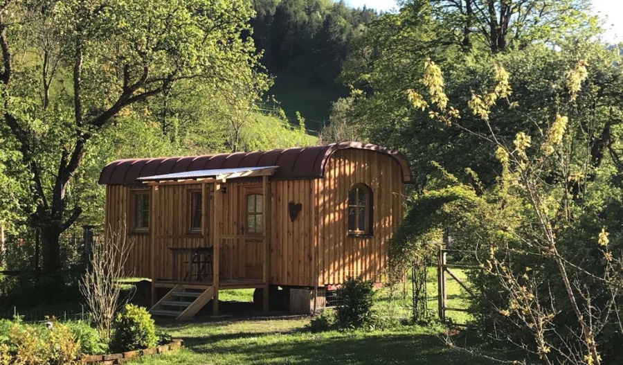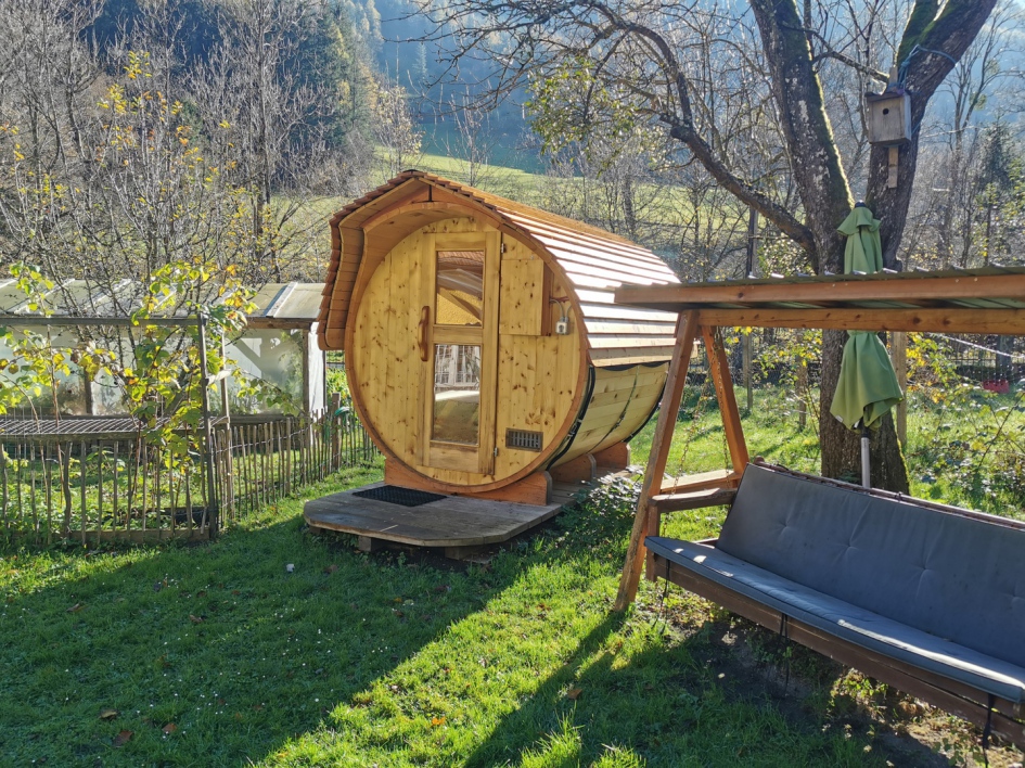 Gemütlich in einem ganzjährig bewohnbaren, weil super gedämmten, Zirkuswagen direkt bei uns im Garten , daneben mit einer tollen Fass-Sauna für die manchmal schon kühlen, Herbst-, Winter-, Frühlingsabende.